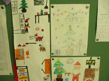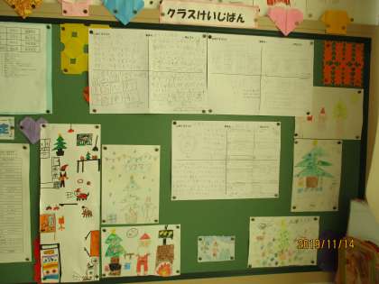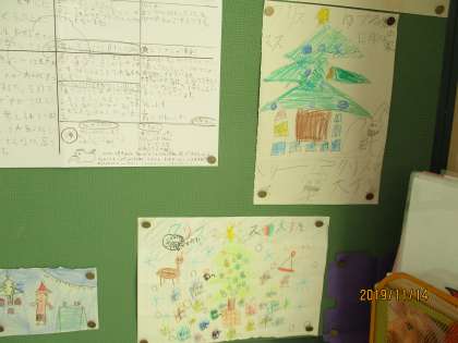 つい最近までは、子ども達がかいたハロウィンの絵がたくさん貼ってあったのですが、私が「ハロウィン終わったね。次は何かな。」と言うと、多くの子がクリスマスの絵をかいて掲示してくれました。掲示板の上には、きめつのやいばのイラストもたくさん飾られています。