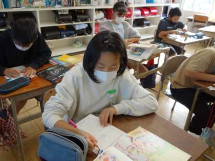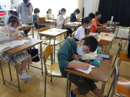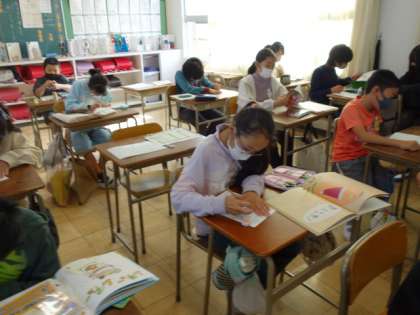 活動のひとつに「ペアで本の紹介カードを交換しよう」というものがあります。6年生はペアの1年生と交換します。この時間はそのカード作りに取り組んでいました。