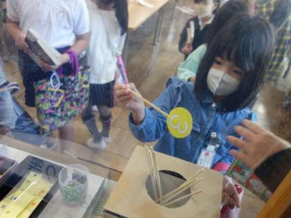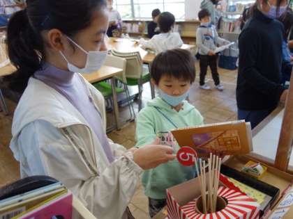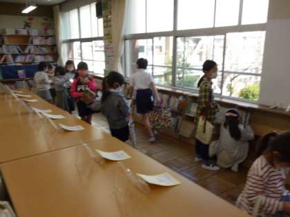 子どもたちに少しでも本に親しんでもらおうと、図書委員会の考案で「どんぐり宝くじ」を始めました。どんぐり宝くじとは、本の貸し出しの時に、1枚くじを引くことができ、くじの数字と借りた本の番号が一致していたら景品がもらえるというもので、外れても3枚集めれば景品がもらえます。この効果もあり、放課は、本の貸し出しで長い列ができていました。