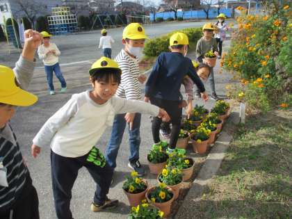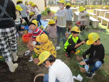 今日の2時間目に、「花いっぱいプロジェクト」で、パンジーの苗植えを行いました。この花は、3月に6年生の卒業式の式場や通路を飾る花として、自分たちで育てていきます。水やりや草取りや花摘みなどの作業を行います。3月にきっと立派な花をさかせることができると思います。