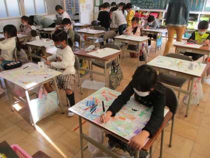 3・4時間目の図工は「わくわくすごろく」をつくって遊びました。大きな画用紙にペンで楽しい「すごろくゲーム」を描きました。また、サイコロも自分たちで作って、楽しく遊びました。