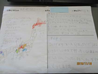 1枚目:行ったことのある都道府県やと県名に関するクイズを作ることができました。「コロナが落ち着いたら、北海道に行きたい。今まで言ったことのある県の場所をぬった。結構行ったことがあってびっくりした。」