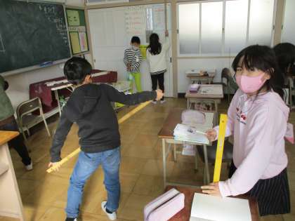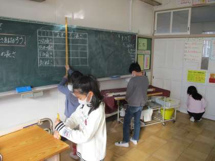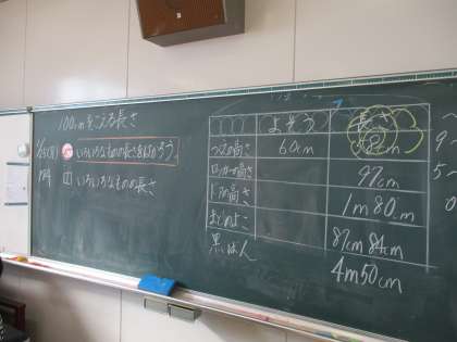 教室内にあるいろいろなものの長さを、まず予想してから、1mものさしを使って計りました。この学習のめあては、およその長さの概念を獲得することと、ものさしを正確に読みとることです。机の高さのような1mに満たないものから、黒板の横の長さのような数メートルもあるものまでいろいろなものを計りました。