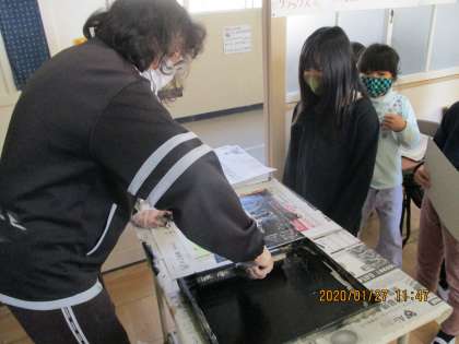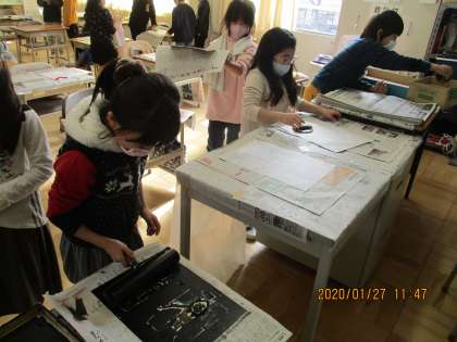 2年生の図画工作科では紙版画に取り組んでいます。1組では、本日、作成した紙はんがで実際に刷ってみました。子ども達は手を真っ黒にしながら、一生懸命刷っていました。作品が完成した後は、「先生、じょうずにできたー」「手が真っ黒だー」と楽しそうにしていました。