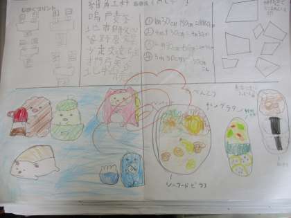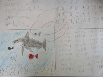 今週も自学でいろいろな学習ができました。「リアルな生き物の絵」「アニメのキャラクターの絵」「料理の絵」「英語」「計算」「漢字」などがありました。中には色を塗ったり、裏にも大きな絵を描いてたりして子もいました。たった1枚の紙に、無限大の素晴らしい学習ができることを証明してくれました。
