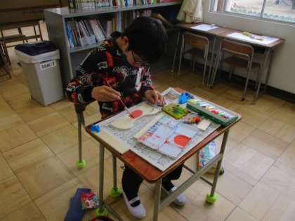 ふれあい・テープカッター作り(2/12) 公開日 2021/02/12 更新日 2021/02/12 ふれあいの部屋 図工の時間は、テープカッター作りで横の絵に絵の具で色付けをしました。細かい所を丁寧に塗っていました。