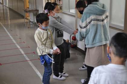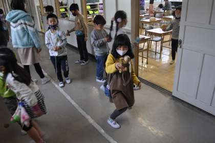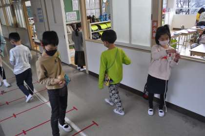 今日はあいにくの天気でしたが、1年生の教室前の廊下では、たくさんの子がこま回しやけん玉遊びに取り組んでいます。