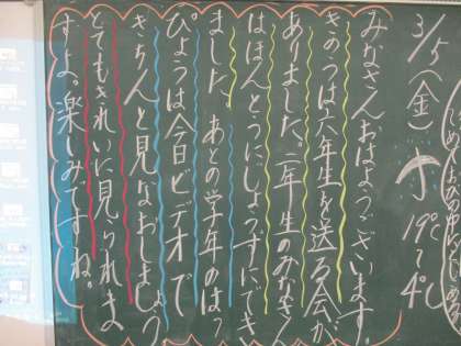 2年生 黒板メッセージ (3/5) 公開日 2021/03/05 更新日 2021/03/05 2年生の部屋 今日は午前中が曇り空で比較的暖かでした。お昼頃から雨が降ってきました。春の長雨と言いますが、これからは雨の日が多くなると思います。でもだんだんと暖かくなってくるのはうれしいです。