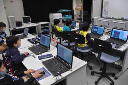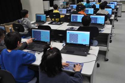 1年生は、プログラミング教育の一環として、パソコンソフトを使って、ロボットの操作をするゲームに挑戦しています。