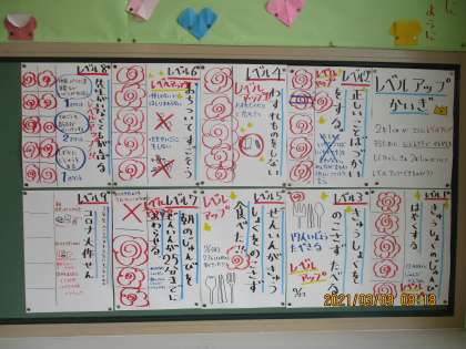 1組では、自分達の課題は何か考えて、課題を解決していくというレベルアップ会議というものを開いています。残り10数日でレベルアップ課題にあがったのが、「コロナ大作戦」でした。きちんと手洗いをし、ハンカチ鼻紙を携帯し、マスクを外さないという基本的なことです。しかし、「残り少ない日々を、みんなで元気にすごすため」という理由があるそうです。残りの日々でレベルアップを狙いつつ、みんなで過ごすためのことを考えられる子ども達には驚かされました。