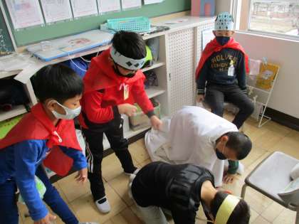 小道具として、布やひもや画用紙を用紙したところ、子供たちは、練習をそっちのけで、小道具づくりに熱中してしまいました。この度合が指導のポイントだと言えます。主は、もともと音読劇だということを納得させて、半ば強制的に練習を行わせました。