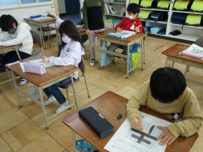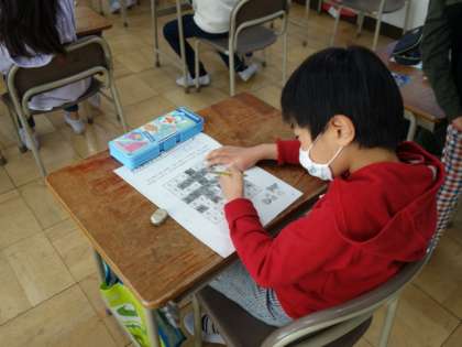 たくさん漢字がある中から、ある1種類の漢字だけ塗りつぶすと、大きな漢字がひとつ出てきます。子どもたちは楽しそうに取り組んでいました。