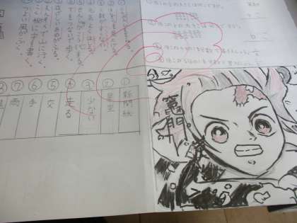 今週もいろいろな自主学習をみることができました。「英語の勉強」「韓国語の勉強」「分数の勉強」「アニメキャラクターの絵」などです。どんな学習でも、自分がやってみたい勉強が一番身に付きます。計算や漢字のの練習でも、できる問題ばかりやっていては効果がありません。そういう意味では、人気の「アニメの登場人物の漢字の名前」はとても難しいですが、関心をもって取り組んでいる子が多いです。漢字は、書けなくても読めることでかなり学習効果があります。