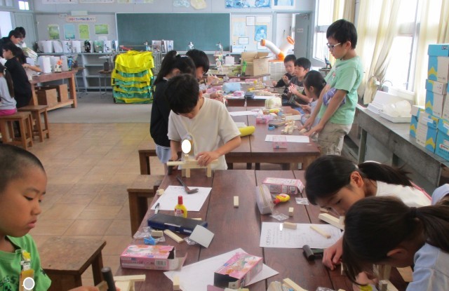 図工では、げんのうを使ってくぎ打ちをしています。木を順番に組んではくぎを打っていきました。まっすぐくぎを打つことにもすこしずつ慣れてきました。気を付けながら作品を完成させていきたいです。