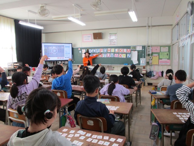 今日の英語活動は、アルファベットの学習をしました。先生の発音を聞いて、ローマ字をヒントにアルファベットを並べ、いろいろな単語を作りました。