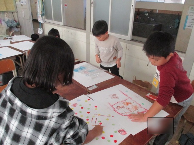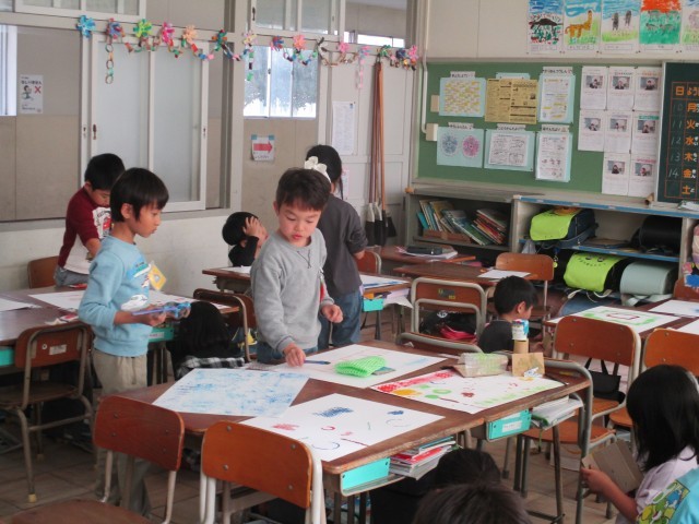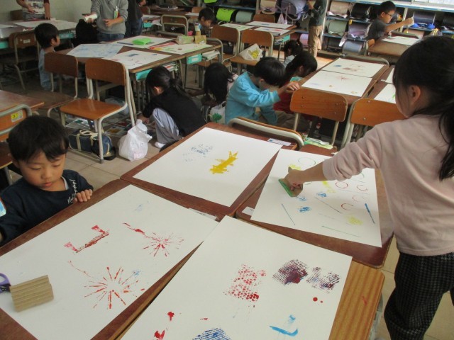 図工の時間は、いろいろな道具や絵の具を使って、スタンピングを楽しみました。