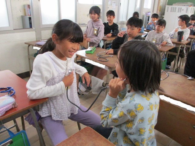 「生きている」と感じることについて『うれしい時』『悲しい時』『おなかがすいた時』『おいしいものを食べている時』と思い思いの意見が出ました。そこで、命を感じるために、自分で脈を感じてみたり、聴診器を使って自分や友達の心音を聞きました。ゲームと現実のいのちの違いについても考えました。