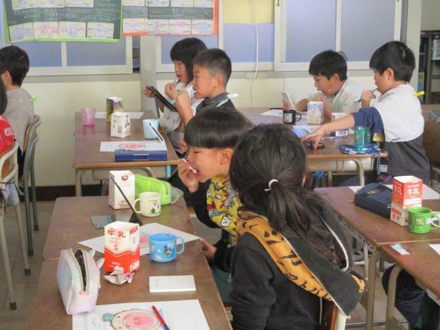 染め出し液で赤くなった汚れの落とし方を知って、「歯ブラシを鉛筆もちして、前歯はたてにみがきたい」と給食後の歯磨きに取り組んでいました。