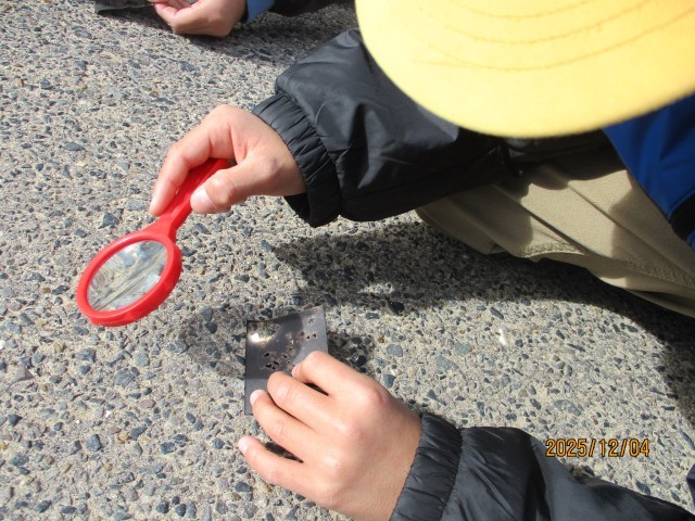 理科では、虫眼鏡を使って、日光を集める実験をしました。黒い紙の一か所にうまく集中させると、熱くなり、煙が出ました。初めての経験に、驚いている子がたくさんいました。