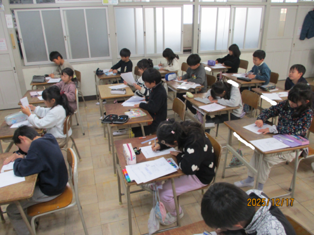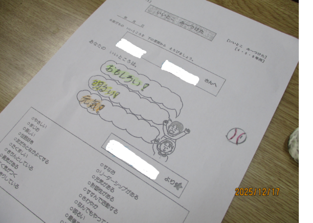 学活では、友達の「よいところ見つけ」をしました。同じ班の友達のよいところやがんばっているところを探して、カードに書きました。カードをもらったときには、みんなうれしそうで、温かい雰囲気に包まれていました。これからも、友達のよいところに目を向けて、生活していくといいですね。