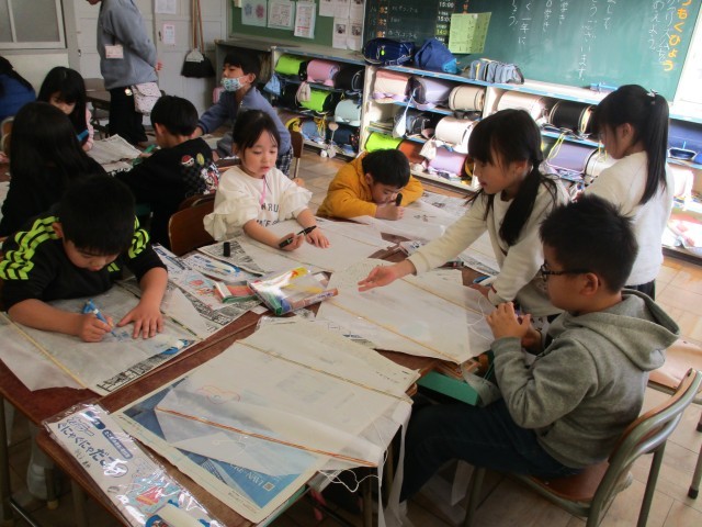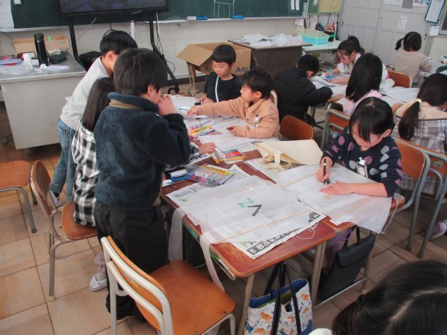 生活科の時間を利用して、凧づくりを行いました。竹ひごをテープで補強して、絵を描きました。