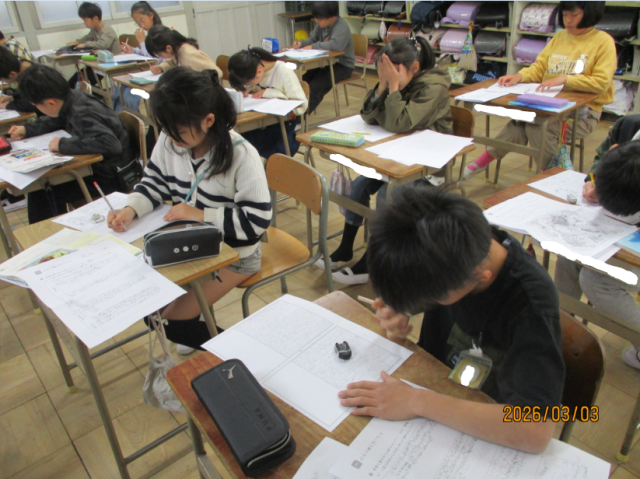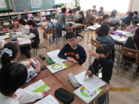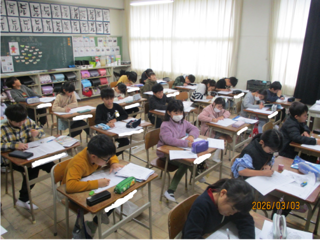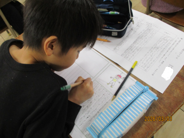 国語では「たから島のぼうけん」という単元で、物語をつくる学習をしています。どうしたら読む人に楽しんでもらえるか考え、自分なりの工夫を加えながら文章を書き進めていました。