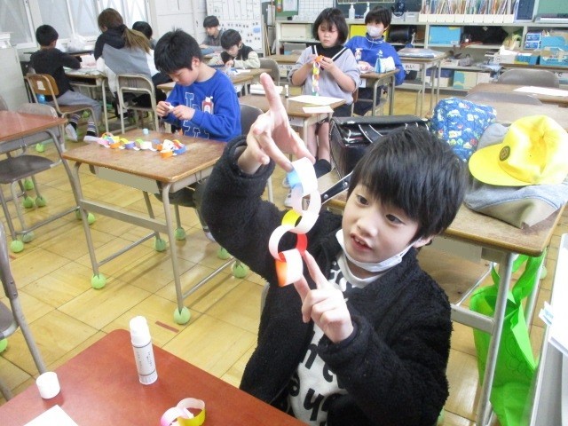 卒業式、入学式に向けて、花飾りや輪飾りなどを作りました。どの子も指先まで使い、丁寧にお花紙をめくったり、紙の輪をつなげたりしました。季節の移ろいを感じ取り、みんな次の学年に向けて気持ちが高まっている様子です。