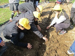 種芋の向きやかぶせる土の量に気を付けながら丁寧に植えていました。
