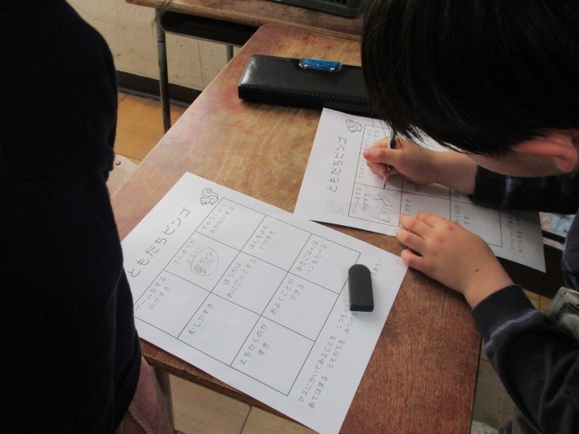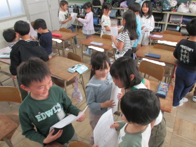 今日の学活では、「ともだちビンゴ」を行いました。「算数が得意な人」や「朝ごはんにパンを食べる人」、「おにごっこが好きな人」など、お題に合う友達を探しました。見つけることができたら、その友達にサインをもらいます。新しいクラスの友達のことが少しずつ分かってきて、仲良くなれましたね。