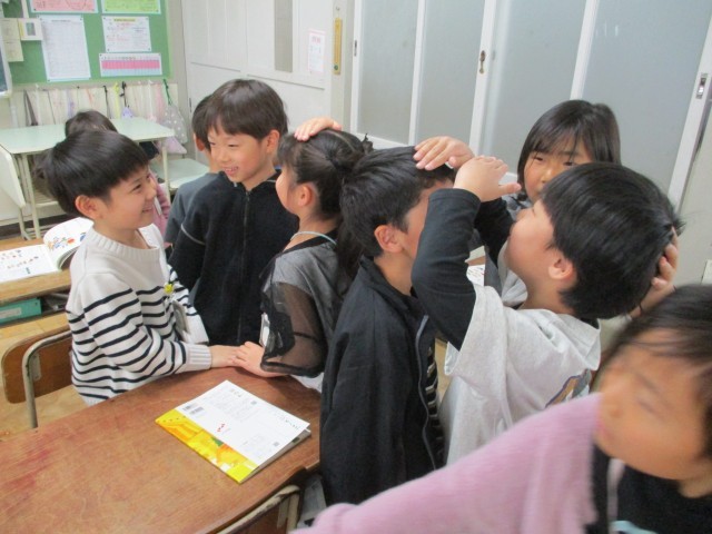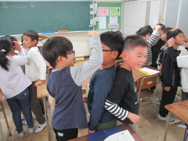 2年生での初めての国語では、「じゅんばんにならぼう」という授業をしました。みんなで声をかけあって、誕生日の順や背の順などに並びました。友達と上手に話しながら、活動することができましたね。