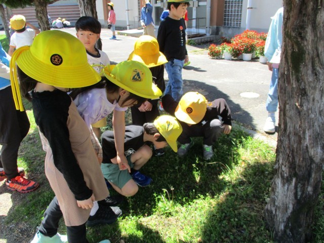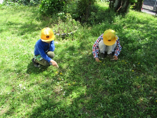 今日は、生活で『春見つけ』をしました。お天気も良く、てんとう虫やミツバチ、菜の花やタンポポ、シロツメクサなど、春をたくさん見つけました。