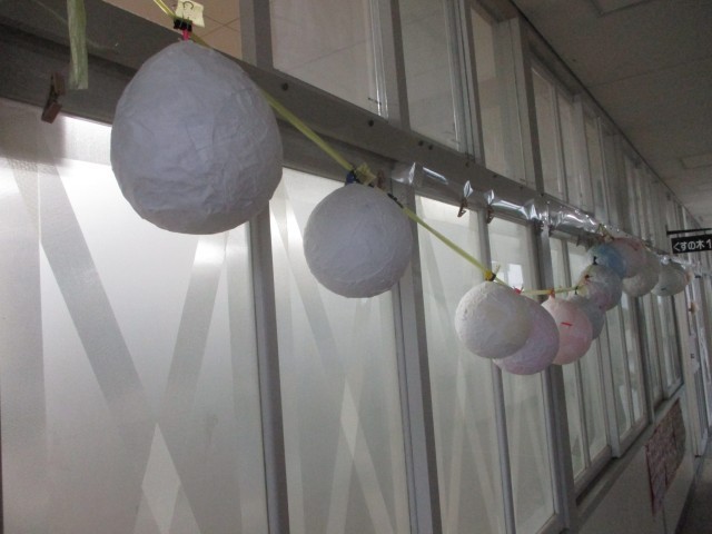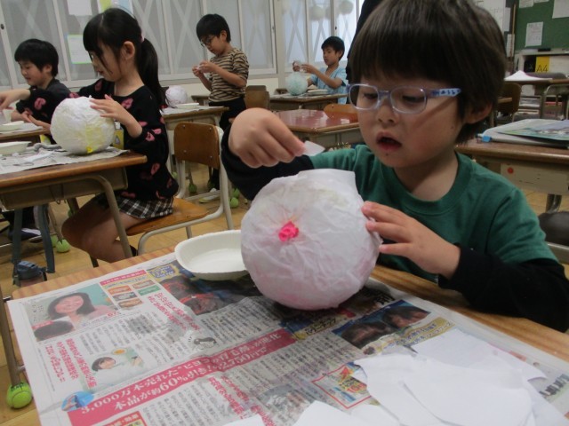 図工の時間に、習字紙を使った「たまごづくり」をしています。薄めたのりをつけ、風船の周りに一枚一枚貼り、卵の形ができました。子どもたちは指を使って紙を広げながら丁寧に貼っていました。