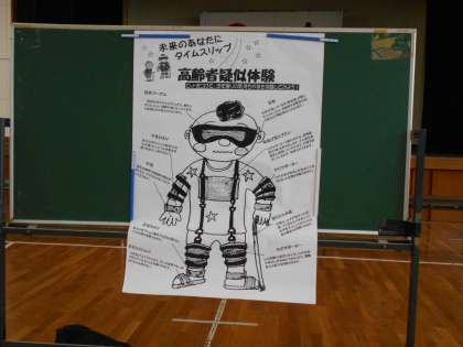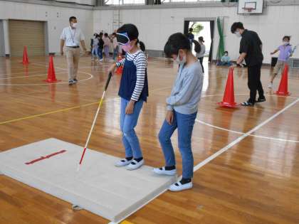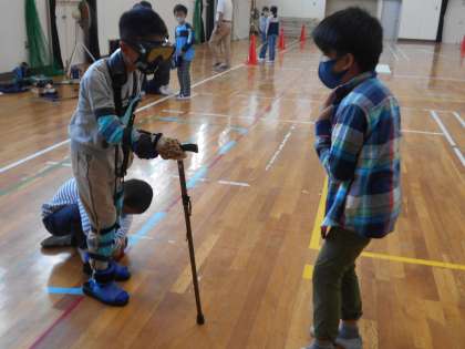 視界がせまくなる眼鏡をかけておもりをあしにつけたりしてつえをもって歩いてみました。「思うように歩けない」と話している子もいました。