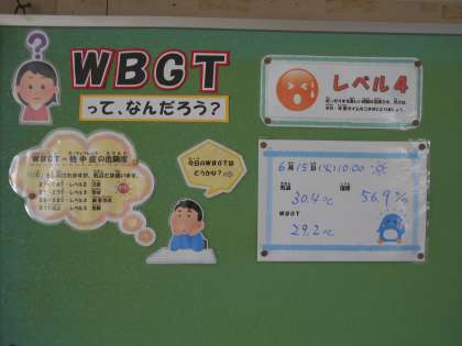 熱中症対策として保健室の前に熱中症の指数が掲示されています。