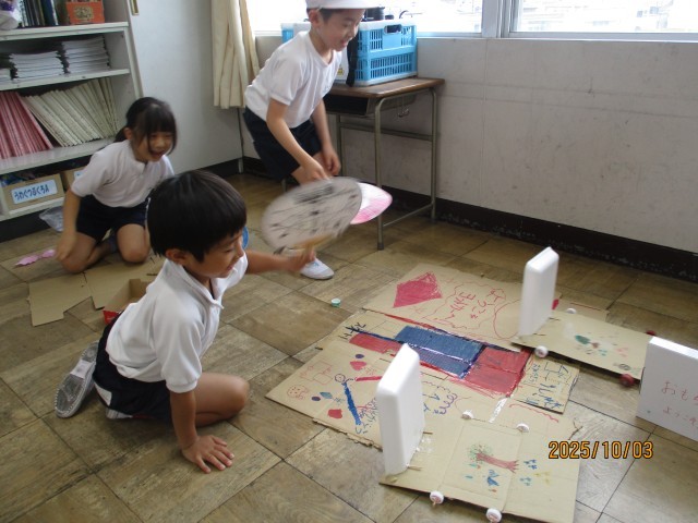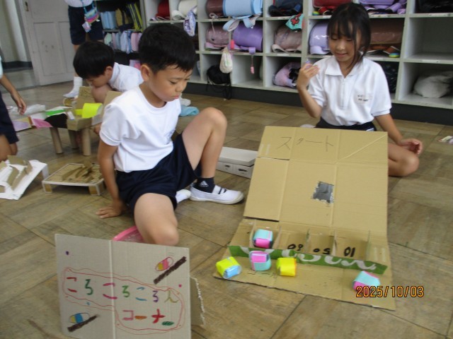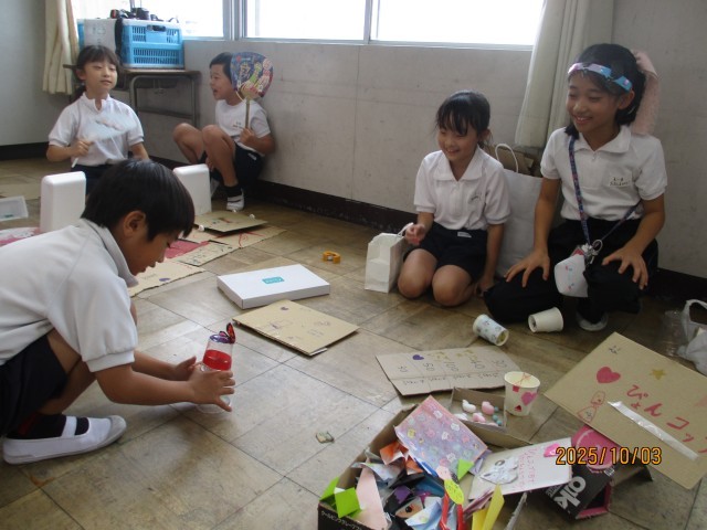 来週、おもちゃフェスティバルに1年生を招待する予定で作業を進めています。今日は、2年生だけでお店屋さんとお客さんをやってみました。おもちゃがうまく動かなかったり、足りないものが見つかったり、呼び込みが上手にできなかったりして、反省していました。少し手直しをして、本番を迎えたいと思います。