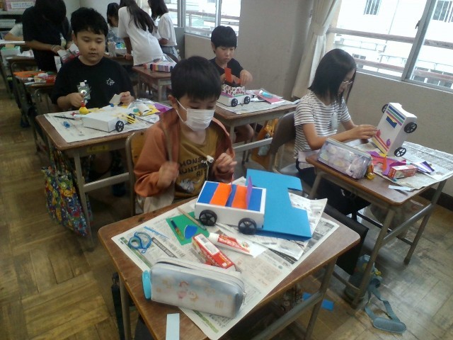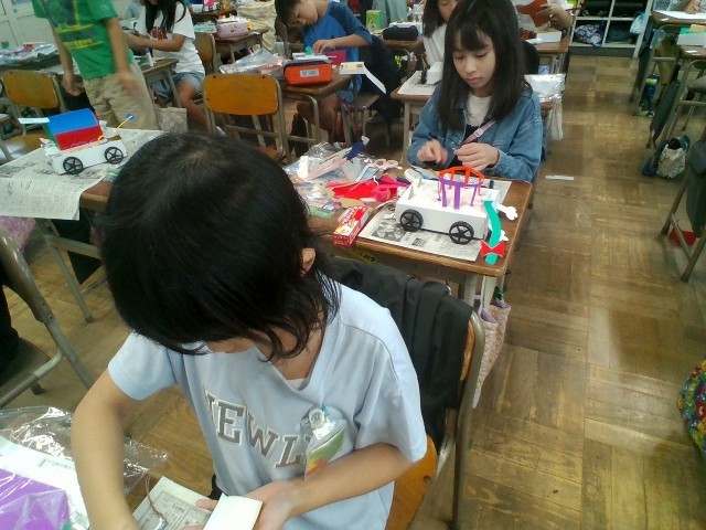 図工の「ゴムでゴーゴー夢の乗り物」で、ゴムで動く車を作り、いろいろな飾りつけをしています。「みゃくみゃく」が運転するバスや水族館になっている乗り物など、自分の夢の乗り物づくりに夢中になって取り組んでいました。