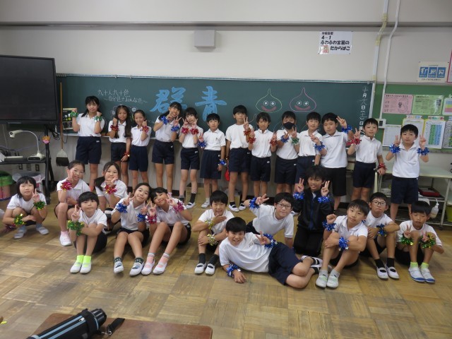 本日は、運動会をご参観いただきありがとうございました。4年生は学年目標の「Go 4 it!」を合言葉に、2学期が始まってからたくさんの練習を重ねてきました。なかには放課の時間を使って自主練習している姿も見られ、4年生九十人の心が一つになっていくのが分かりました。また、硬かった表情も今日はとても自然な笑顔が見られ、ひとりひとりが最高のパフォーマンスを発揮することができました。