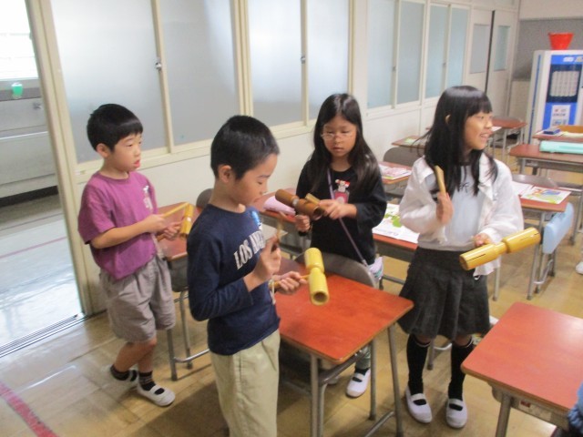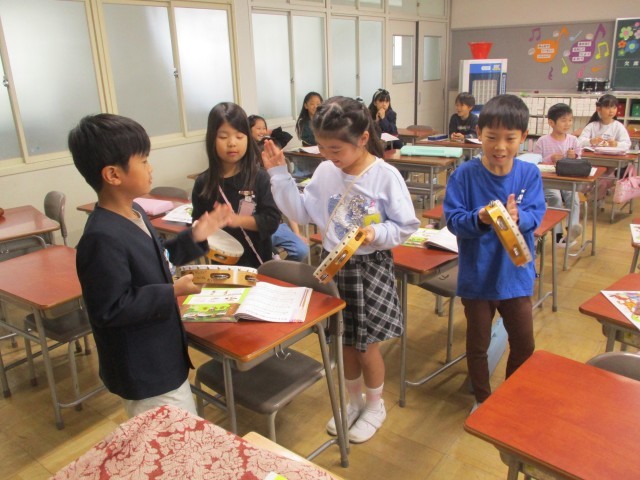 音楽の「森のたんけんたい」の学習では、歌詞に合う楽器の音を工夫しながら、歌に合わせて演奏しました。