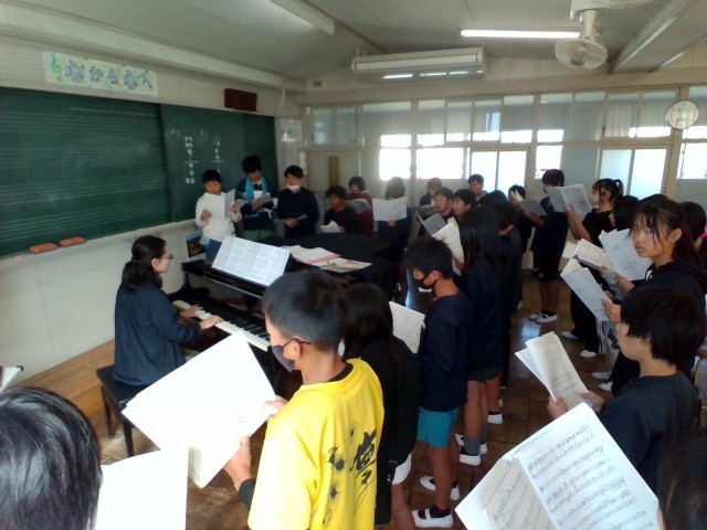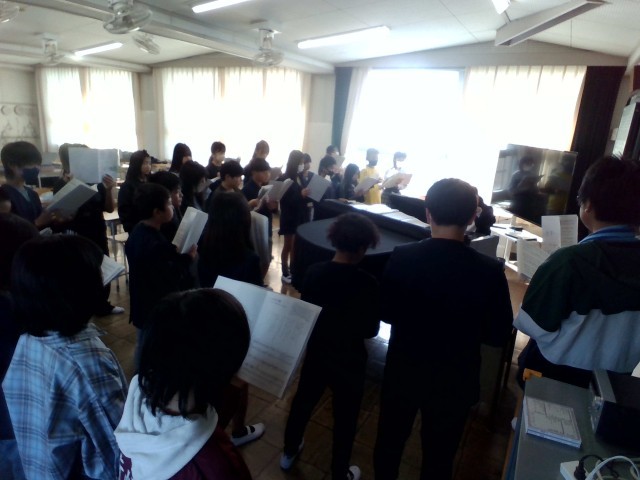 音楽の授業の様子です。「いのちの歌」を合唱しています。