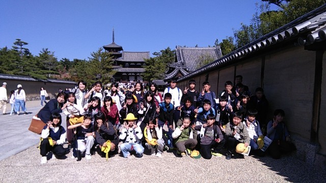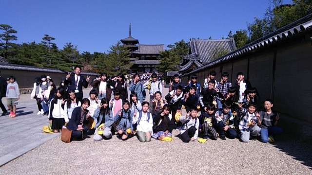 最初の目的地、法隆寺に到着しました。お天気もよく、青空に五重塔が映えています。