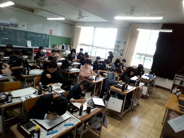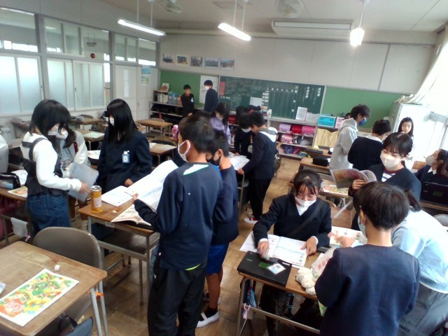 英語の授業では、世界とのつながりについて、発表するための準備をしていました。1人で考えてわからないことは、周りの仲間に聞いたり先生に聞いたりして課題解決に向けて学習を進めていました。家庭科の授業では、調理実習に向けて班員と役割分担を相談しました。社会の授業では、「雪舟のような国宝級の水墨画をかこう」というめあてのもと、習字道具を用いて学習を進めました。