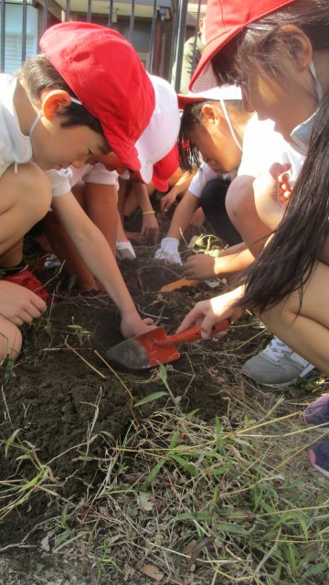 サツマイモを掘りました。小さい芋でしたが、一生懸命みんなでサツマイモを探しました。