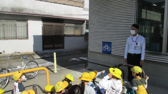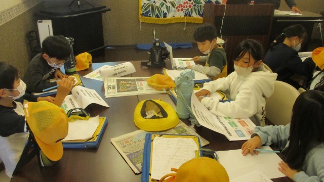 まちたんけん、赤門コースの様子です。郵便局と中日新聞社へ行きました。郵便局では、切手やはがきだけでなく、様々なものが販売されていることを知りました。分かりやすい掲示物がたくさんあり、子どもたちは興味いっぱいに見ていました。中日新聞社では、実際に新聞の中にちらしを入れる体験をしました。朝早くから仕事をしている事実を知り、子どもたちは驚いていました。