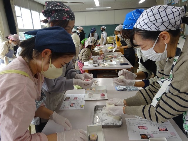 本日は、PTA主催で和菓子作り教室を開催しました。今伊勢にある野田屋菓子舗の野田錦市様にお越しいただき、丁寧に教えていただきました。