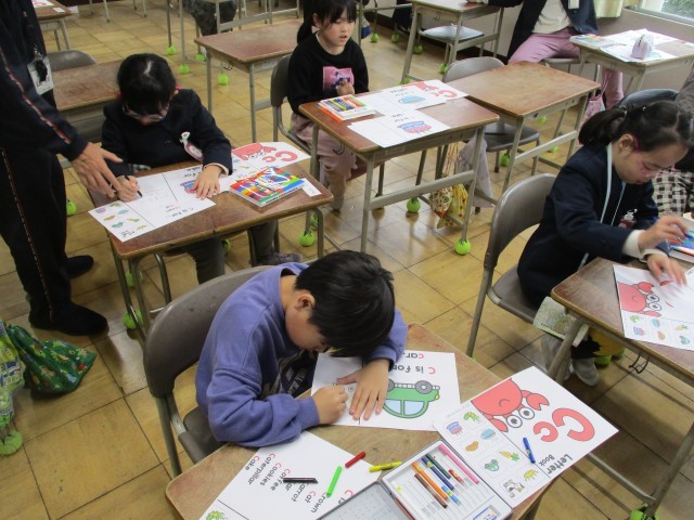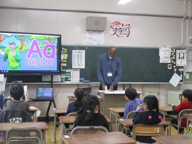 5時間目は、ジョン先生の英語でした。フォニックス英語を楽しく歌いました。1・2年生もアルファベットを見様見真似で一生懸命書いていました。