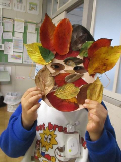 交流の図工で、紅葉した葉っぱを台紙に貼り、素敵なお面を作った子がいました。