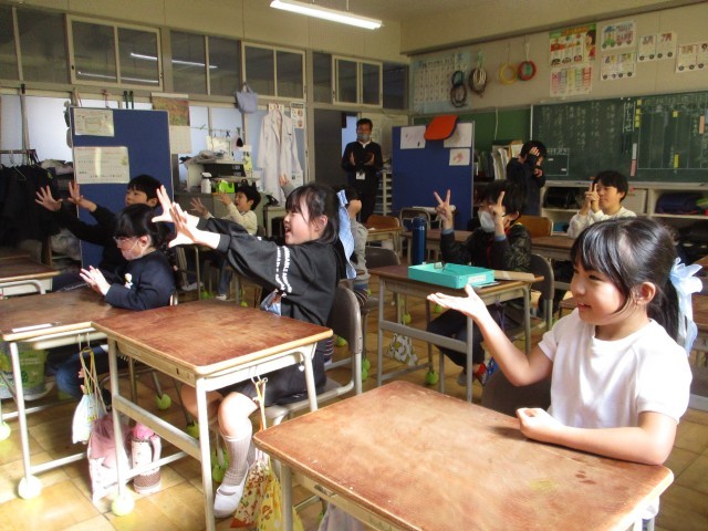 手と口を、グー、チョキ、パーと連動させるトレーニングをしました。みんなやる気いっぱいです。「もっと早いリズムでやりたい!」と言っていました。