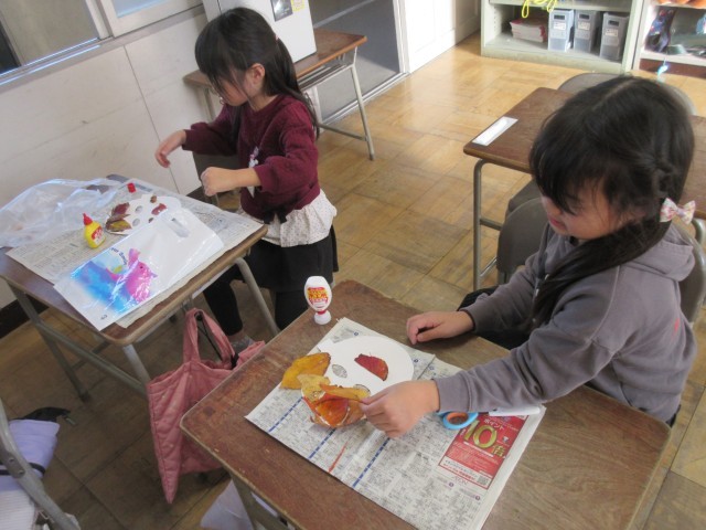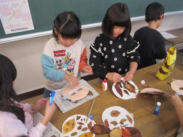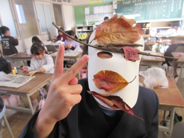 生活科の学習で、秋の自然を使った「秋のおめんづくり」を行いました。どんぐりや落ち葉、木の実など、自分たちで集めた材料を組み合わせて思い思いのお面をつくりました。完成したお面を満足そうに見せ合う子供たちの笑顔が印象的でした。秋ならではの楽しい活動ができました。