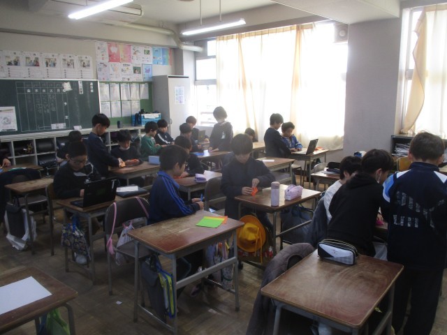 今年度の貴船小では、5年生発案である廊下の白線の上に鶴を並べ、右側歩行を促すといった取り組みを行っています。その取り組みをさらに貴船小全体へ波及させるため、ペア学年で鶴を折りました。
