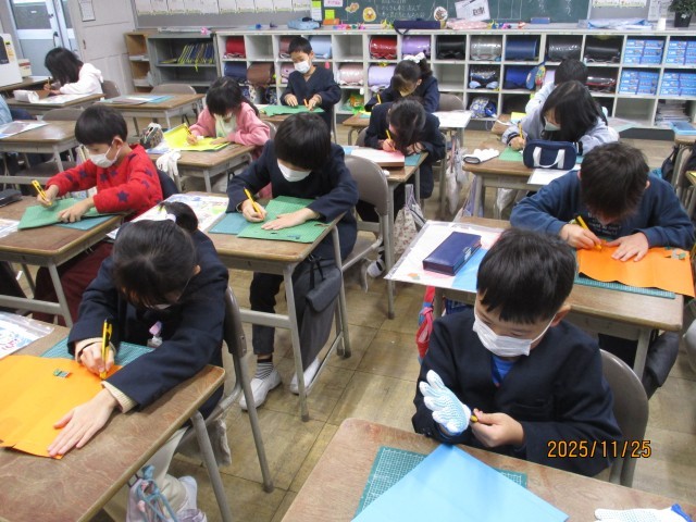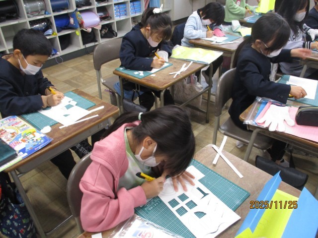 初めてカッターナイフを使用しました。まず、練習用の紙で線に沿って切ったり、形を切り抜いたりしました。次に、自分の作品を作り始めました。手を切らないよう注意しながら、作業を進めました。